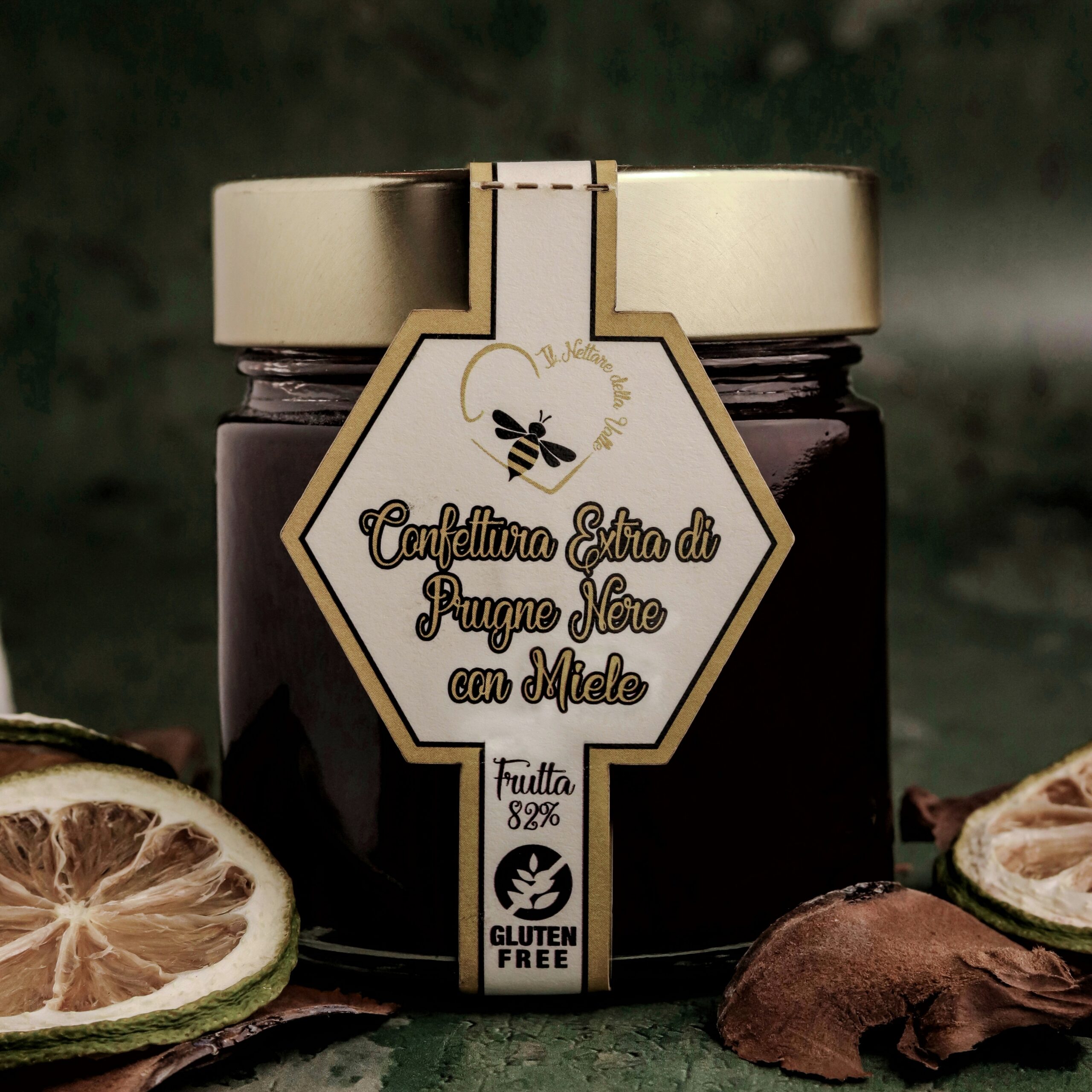 La nostra Confettura Extra di Prugne Nere è una conserva dolce, aromatica e raffinata, creata per esaltare al massimo il sapore intenso del frutto maturo. Perfetta a colazione, da spalmare su fette biscottate o pane fresco, diventa una farcitura golosa per biscotti, torte e crostate, aggiungendo eleganza e gusto ai vostri momenti di dolcezza.