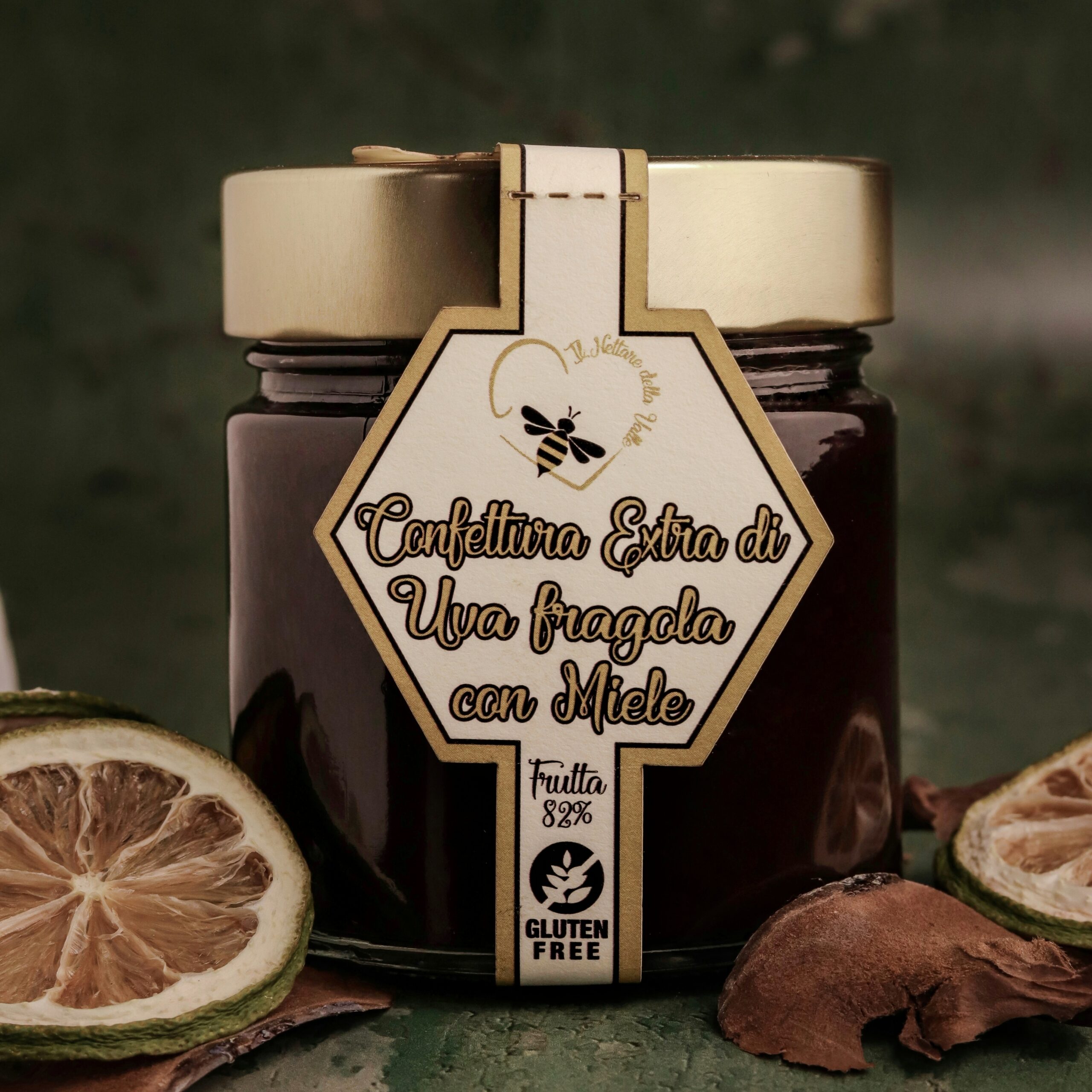 Preparata con acini maturi e profumati di uva fragola e miele, questa confettura artigianale vanta oltre l’82% di frutta, senza conservanti, additivi o addensanti.